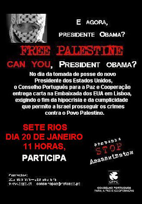 Depois de 22 dias de raids da força aérea, que em 2500 raids despejaram 1000 toneladas de bombas e fósforo branco sobre o martirizado povo palestino (sem contar o que foi lançado pela artiharia, tanques, infantaria e canhoneiras), o estado nazi-sionista anuncia que vai suspender o seu ataque. Mas reserva-se o direito de reinicia-lo quando muito bem lhe apetecer. Os 1220 mortos e 5500 feridos na Faixa de Gaza ainda não satisfizeram o governo sionista. É apenas uma suspensão para não constranger Obama no dia da sua posse como presidente. Desta guerra genocida contra um povo indefeso já se podem fazer algumas constatações: 1) A bravura, dignidade e coragem do governo legítimo do Hamas e das demais organizações democráticas e progressistas do povo palestino, como a FDLP , que não se renderam ao agressor sionista. 2) O papel vergonhoso desempenhado pela Autoridade Palestina encabeçada pelo sr. Abbas, que se comportou como o cúmplice amestrado do imperialismo e do governo sionista. 3) A atitude dúbia ou conivente de muitos países árabes, particularmente o governo egípcio. 4) O papel hipócrita do governo português (e da UE) pondo em pé de igualdade o criminoso e a vítima. 5) O dever moral das instituições internacionais de levar a julgamento os responsáveis pelos crimes de guerra israelenses. 6) O facto de que o povo de Gaza, agora com as suas infraestruturas destruídas, continua submetido a um cerco que visa dizimá-lo pela fome, pela falta de assistência médica e de tudo o mais. 7) A realidade de que o problema continua por resolver e que continua a ser indispensável a criação de um Estado Palestino, autónomo, livre e democrático.
